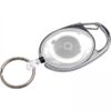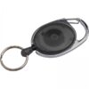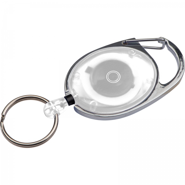 Plastikowy brelok z metalowym karabińczykiem, klipsem do paska oraz kółkiem na zwijanej lince.