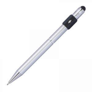 Długopis wykonany z aluminium o metalicznym połysku. Posiada wkład piszący na niebiesko.