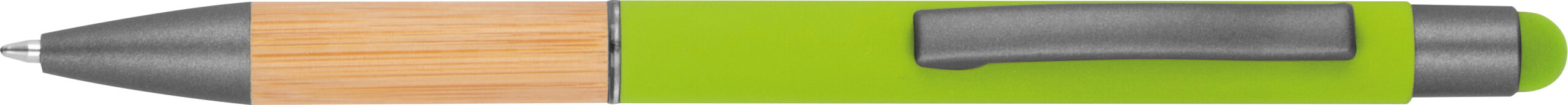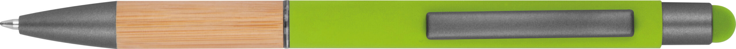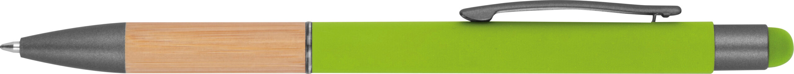 Metalowy długopis z wkładem piszącym na niebiesko, końcówką z funkcją touch pen do obsługi ekranów dotykowych i strefą chwytu wykonaną z bambusa.