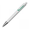 Plastikowy długopis z wkładem piszącym na niebiesko. Długopis posiada białą obudowę i kolorową aplikację pod klipem.