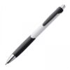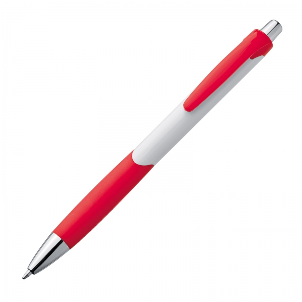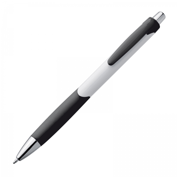 Długopis plastikowy, wyposażony w klips i gumową strefę chwytu oraz niebieski wkład.