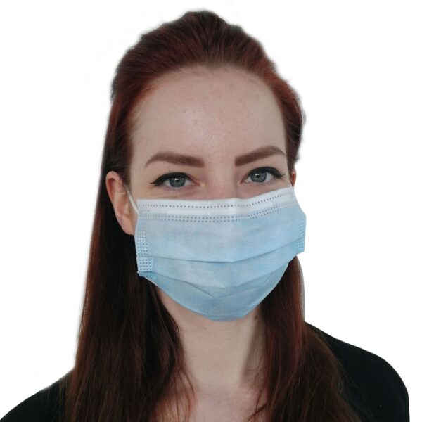 Trójwarstwowa maseczka ochronna mocowana na elastyczne gumki, wykonana z włókniny i materiału meltblown. Posiada wszyty drucik, który ułatwia dopasowanie maseczki do kształtu twarzy.
