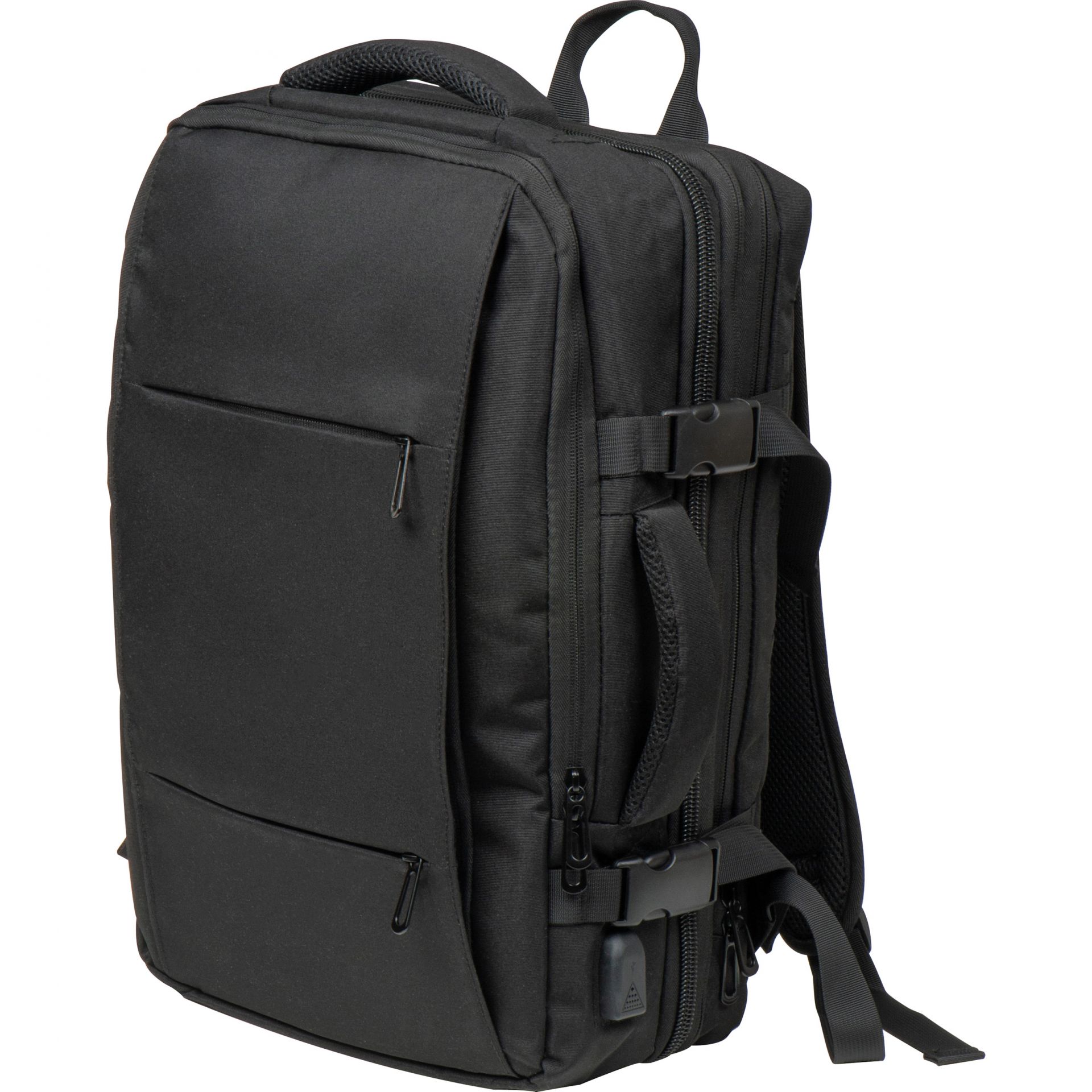 Plecak podróżny otwierany jak walizka, z trzema przegródkami zapinanymi na zamek. Dobrze zorganizowane wnętrze wyposażone jest w przegródkę na laptopa, wiele mniejszych przegródek oraz kieszeń z siatką do przechowywania kosmetyków. Pojemność 22l, dzięki bocznym paskom można powiększyć do 37l.