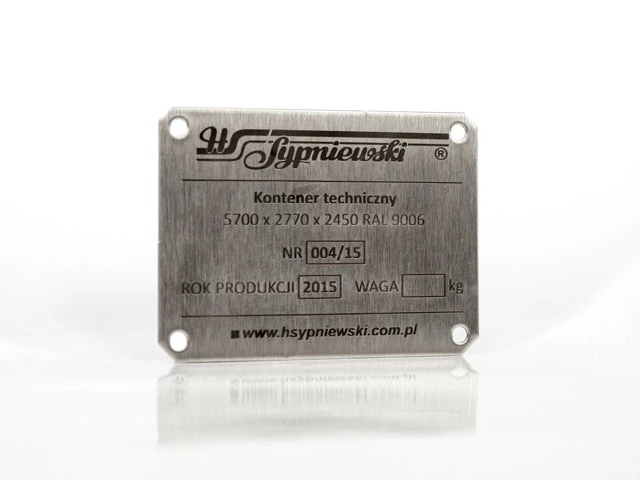 - Tabliczki znamionowe metalowe z blachy nierdzewnej – Podłoże : blacha nierdzewna dowolnej grubości, nadruk farbą chemoutwardzalną, lub grawer laserem YAG. Mocowanie : otwory na śrubki, nity itp. lub warstwa samoprzylepna.