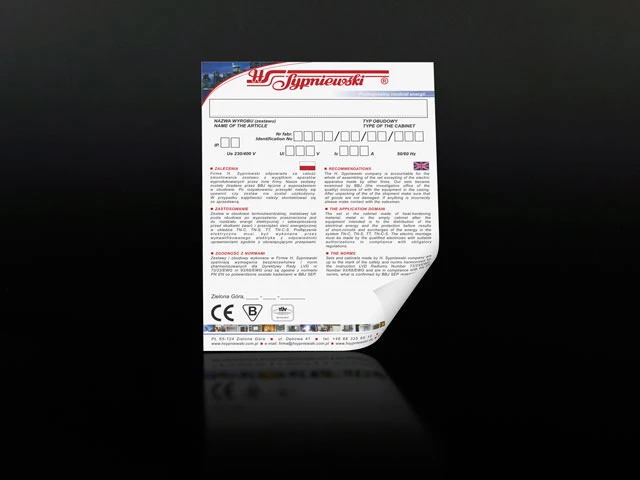- Tabliczki znamionowe plastikowe PVC lub PP – Podłoże : plastik biały, kolor lub bezbarwny dowolnej grubości, nadruk farbą chemoutwardzalną. Mocowanie : warstwa samoprzylepna.